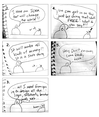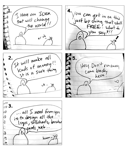 You will find funny (hilarious) blogs all over the internet written by frustrated designers who have to deal with this sort of thing on a daily basis. Even though my primary work is as a photographer, I have had people ask me to do work - for free - with some future promise of business if "things go well." Most designers have a story about somebody trying to get free stuff. The comic I listed above courtesy of designer James Tadeo's